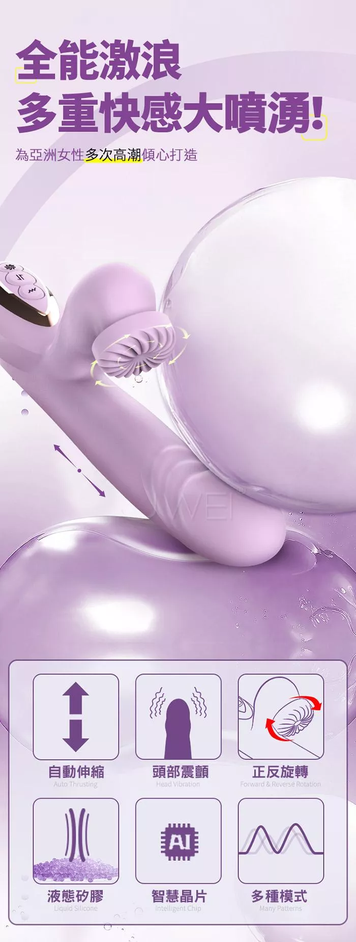 全能激浪,多重快感大噴湧!為亞洲女性多次高潮傾心打造;獨特旋轉 技術,內外總攻"火力"全開,快速引爆全身嗨點,強勁動力旋轉,蜜豆 被狂轉猛舔,讓你爽到停不下來;碩大圓潤頭部伸縮震顫 告別“無緣G 點高潮體質”柔軟矽膠材質,絲滑圓潤使用安心,無異味,不撐大、不 損傷,女性應該拋開傳統思想的束縛,勇敢追求性愛的權利