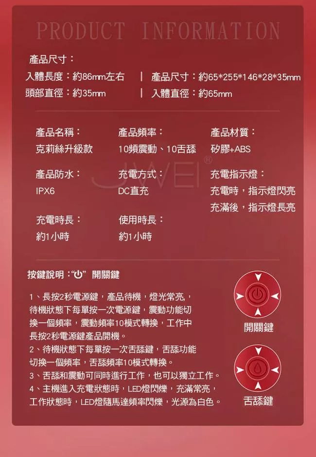 ■尺寸:大小詳如圖片標示■材質:矽膠+ABS■供電:USB充電■特色:10頻震動、10頻舌舔、生活防水