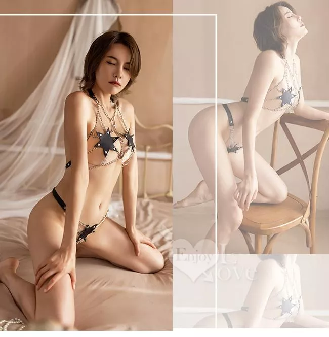 情趣比基尼!金屬鏈條皮質鉚釘六角星三點式兩件組#535651