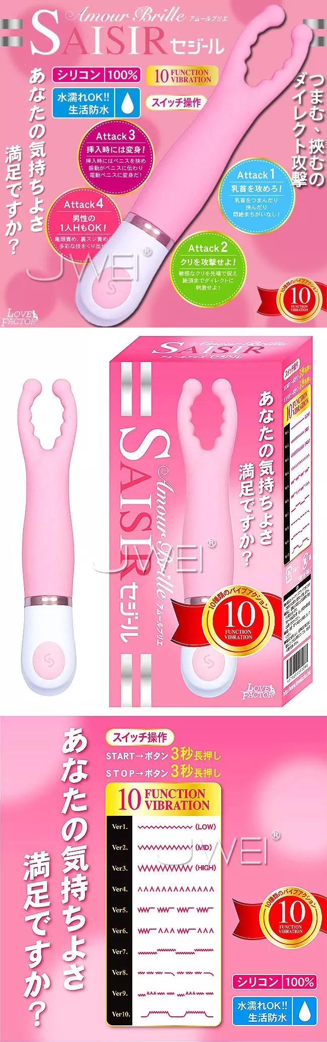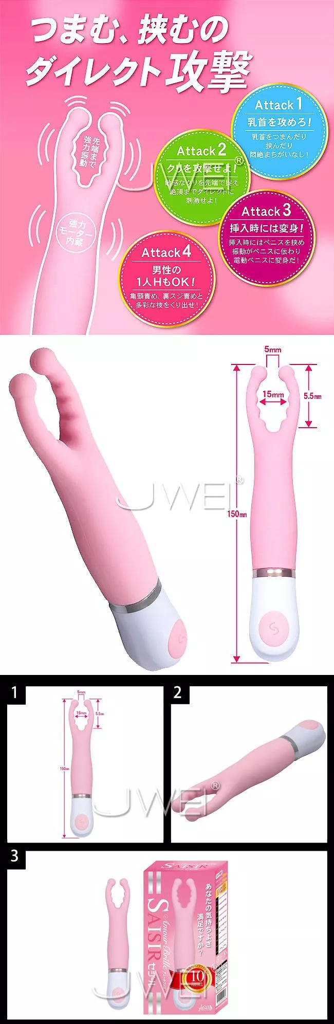 先端部分が2又になった、敏感部分を挟むようにして刺激するバイブレーター。 ボディ上部に強力なモーターが内蔵されているので、10種類という豊富な振動が先端までしっかりと伝わり、クワガタのような2又形状になっているので、乳首やクリなどを挟み込んで、敏感部分をピンポイントで刺激することができます。 さらに、細身のボディなのでそのまま挿入することも可能で、男性が挿入するときにペニスを挟み込めばお互いに振動を感じることができ、男性の1人エッチ用として、亀頭責めや裏スジ責めといった使い方もできちゃいます。 あなたのアイデア次第で、無限の楽しみ方ができちゃうバイブです。